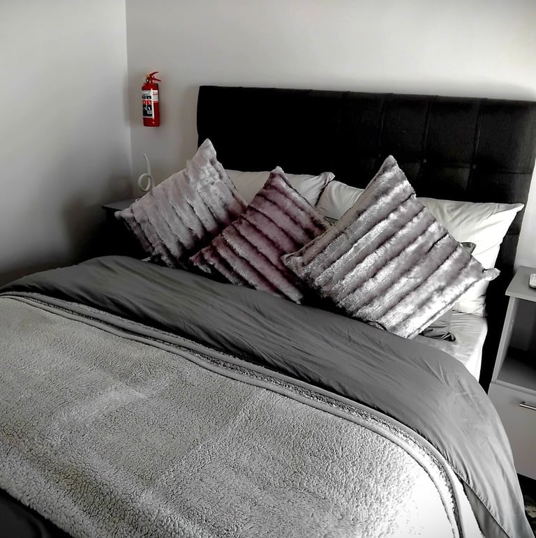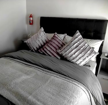 Escape to this cozy and stylish guesthouse bedroom, where plush bedding, soft faux-fur pillows, and soothing grey tones create the perfect space to relax and unwind. Enjoy a peaceful night's sleep in the comfortable bed and make yourself at home in this inviting retreat.