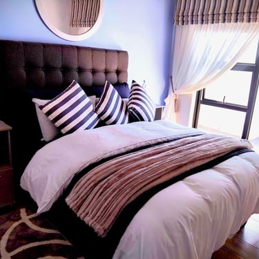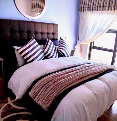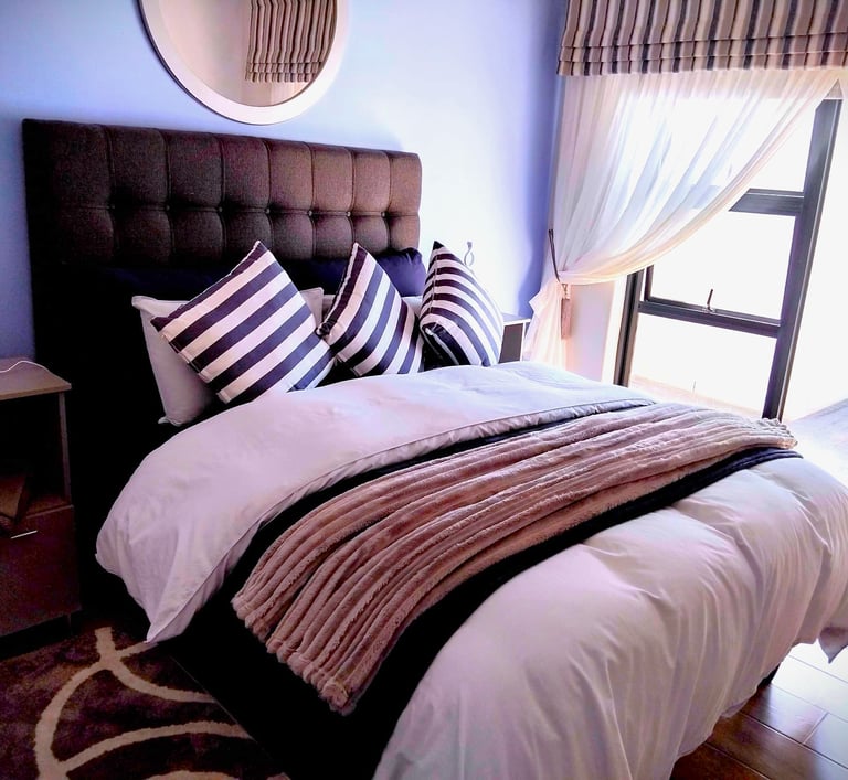 This elegant bedroom offers a serene retreat with its plush tufted headboard, cozy bedding in soothing white and navy tones, and stylish striped pillows. Bask in the soft natural light from the large window, unwind in comfort, and enjoy a peaceful stay in this beautifully designed space.