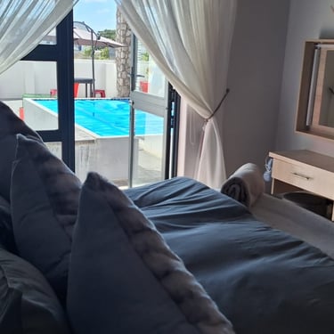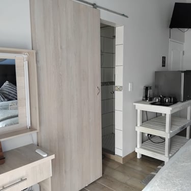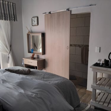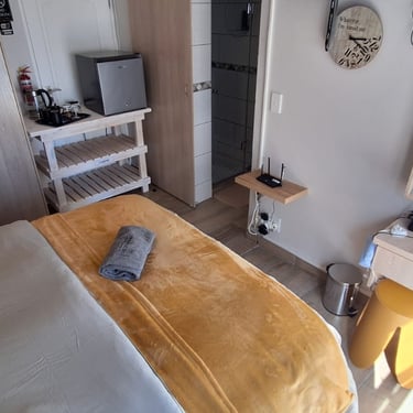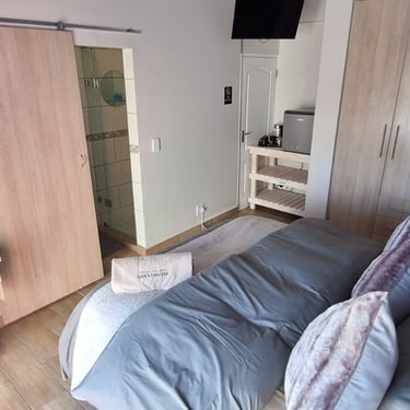 Generously sized cupboards offer ample storage for your belongings, and a convenient laundry service is available upon request. For added convenience and comfort, each room is equipped with a bar fridge and a coffee station, allowing you to enjoy a refreshing drink or a warm cup of coffee at any time. Entertainment is at your fingertips with a TV featuring DStv, and a phone charging station is also provided to ensure you stay connected throughout your stay.