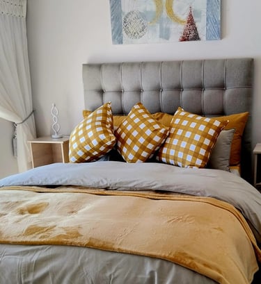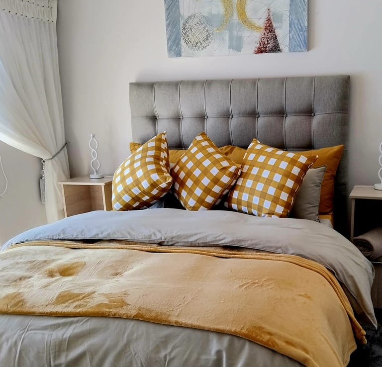 Welcome to this stylish and cozy guesthouse bedroom, where comfort meets modern elegance! Relax in a plush bed with soft mustard yellow and grey bedding, unwind against the tufted grey headboard, and enjoy the warm ambiance created by charming gingham pillows, sleek nightstands, and soft natural lighting from the window.