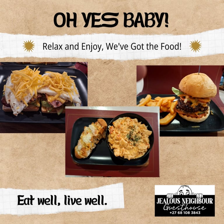 Adri’s exceptional cooking is a true highlight, with every dish expertly prepared and bursting with flavor, ensuring a dining experience that’s as memorable as it is delicious. Enjoy a mouthwatering English breakfast for R100 per meal and a hearty supper for R130 per meal—available by arrangement only. Indulge in meals so good, even your neighbors will be jealous!
